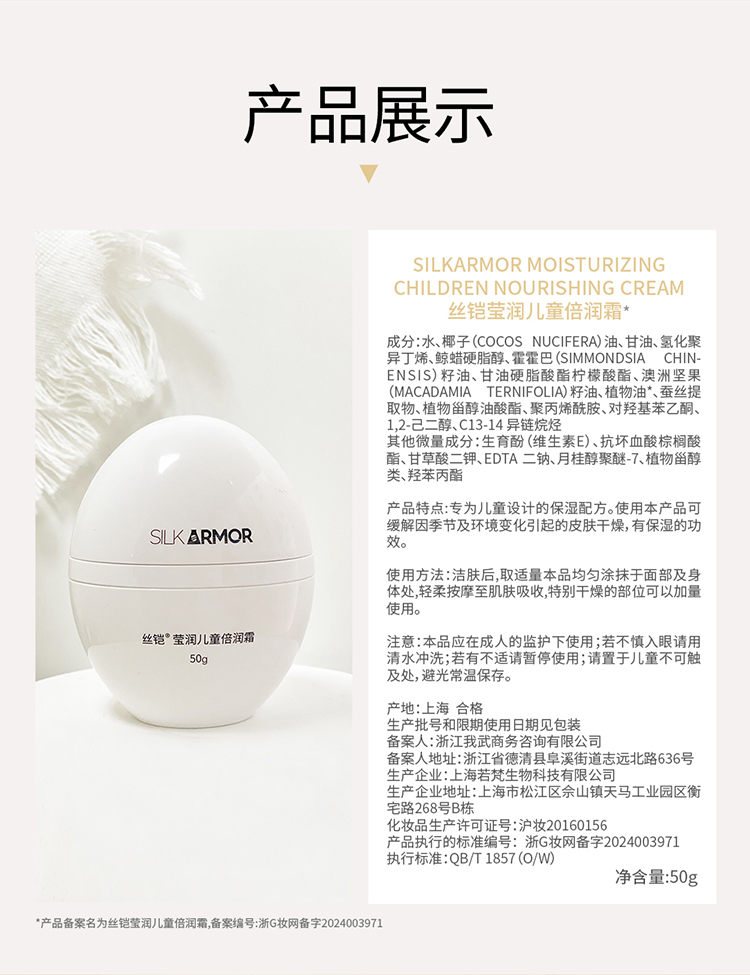 【备案编号】:浙G妆网备字2024003971 【产品功效】:专为儿童设计的保湿配方。使用本产品可缓解因季节及环境变化引起的皮肤干燥,有保湿的功效。 【使用方法】:洁肤后,取适量本品均匀涂抹于面部及身体处,轻柔按摩至肌肤吸收,特别干燥的部位可以加量使用。 【适合人群】:儿童 【有效期限】:3年